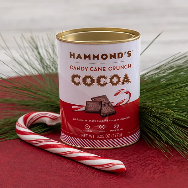 - Candy Cane Crunch Cocoa Mix Tin by Hammond’s – 6.25 oz.