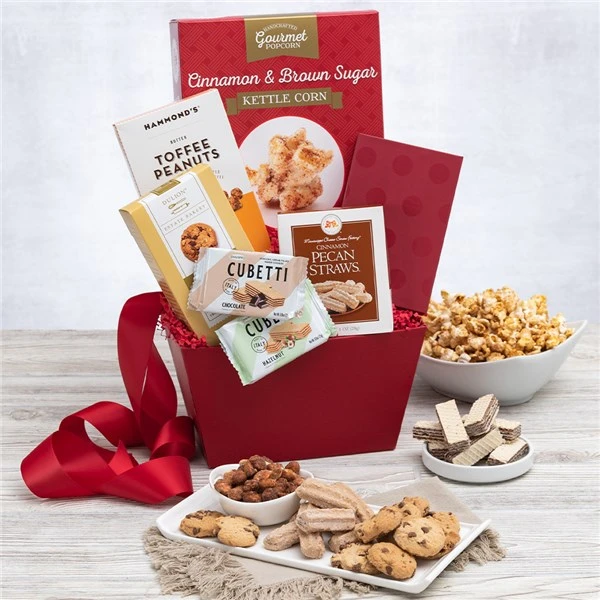 There are few people who can resist the combination of sweet and salty treats! That’s why we created this beautiful gift, which brings together a carefully chosen selection of decadent cookies and delectable snacks. Complete with southern cinnamon pecan cookie straws, and handcrafted cinnamon & brown sugar popcorn. This beautiful arrangement makes an irresistible gift for anyone and for almost any occasion!